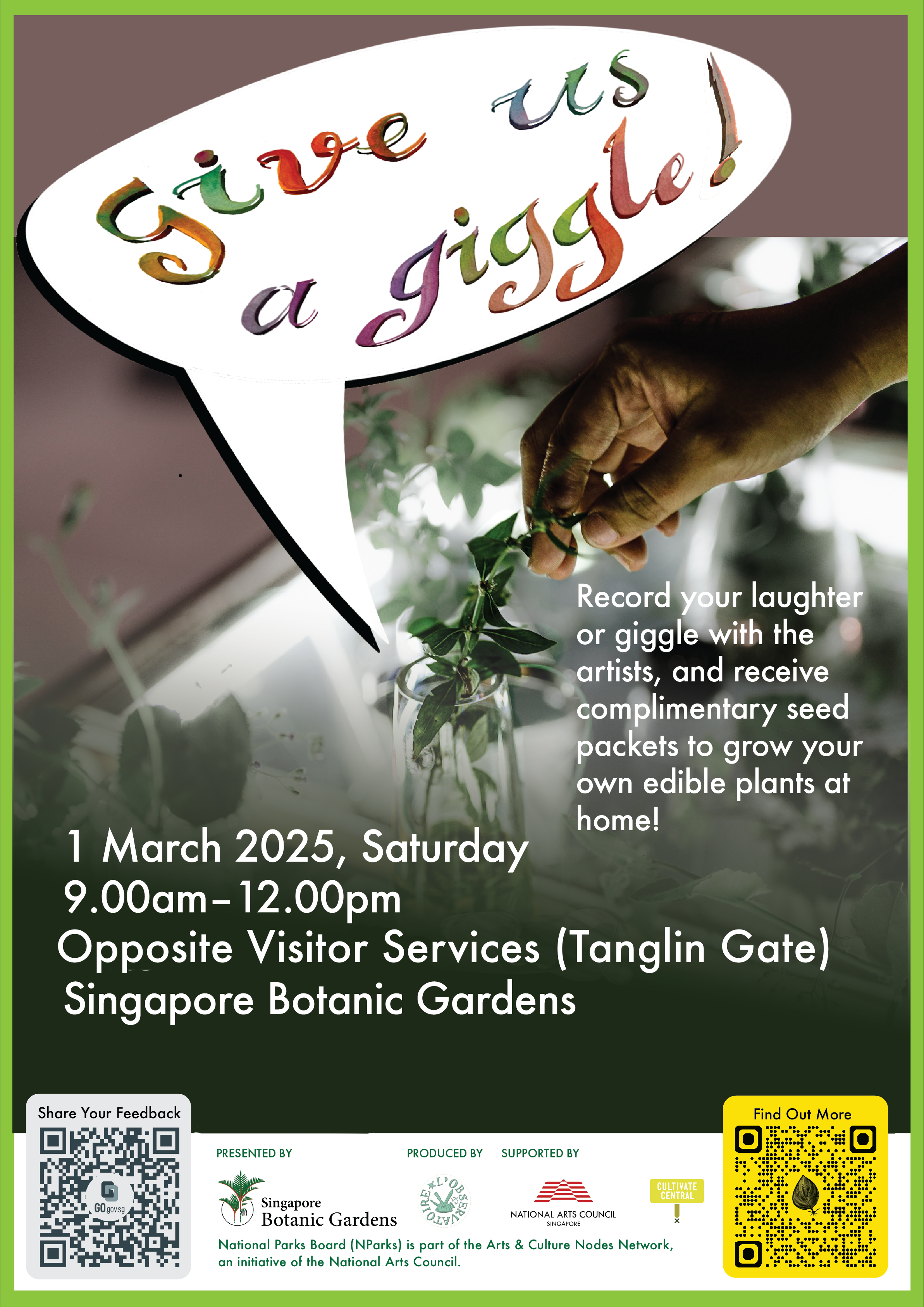 Conceived by the artist-scientist Isabelle Desjeux, and co-created with visitors to the Singapore Botanic Gardens, Giggling Greens exhibits some of Singapore’s common edible and fragrant plants for a quirky and light-hearted interaction with the public.